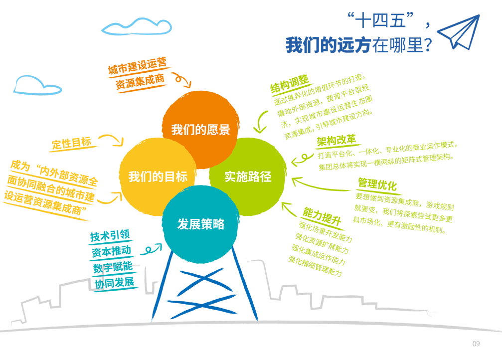 站在“十四五”的新起点,我们不仅要发挥内部产业链协同的优势,更要跳出“自给自足”的圈子,打造更为开放包容的平台,协同和整合内外部的优质资源,共同为城市发展赋能。“城市建设运营综合服务商”将向着“城市建设运营资源集成商”全面升级-我们将以开放、融合的姿态,精准定义我们的未来。