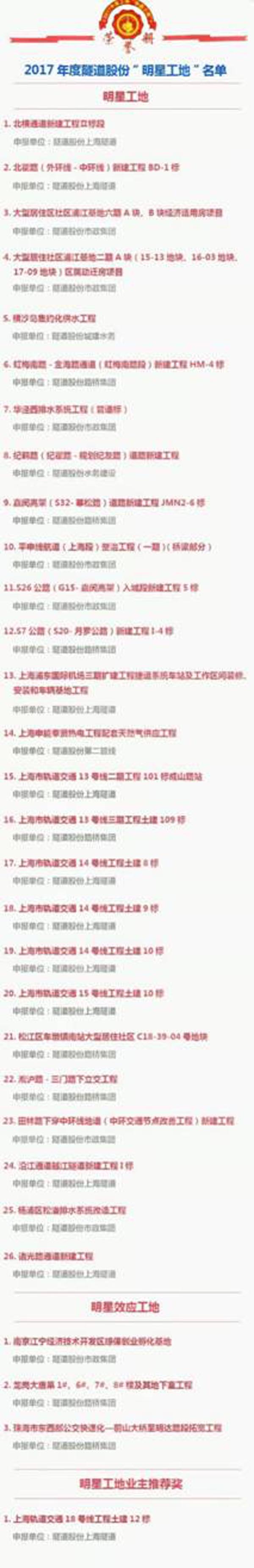 5月26日,2017年上海“明星工地”表彰大会在世博会地区A片区绿谷项目现场举办,隧道股份30项工程受颁“明星工地”荣誉!