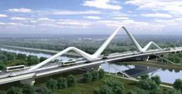 沪青平公路桥靠近崧泽古文化遗址,主桥主跨为108m。将桥梁结构化繁为简,采用线条简洁明快的三角桁架拱,返璞归真,挺拔有力。