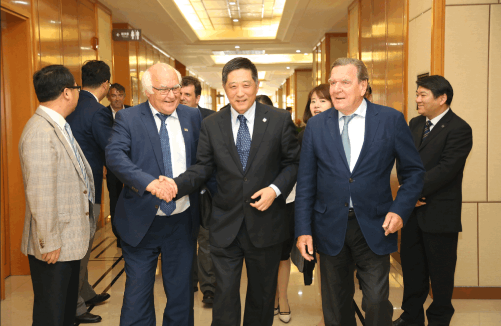 会上,德国前总理、海瑞克监事会副主席格哈德•施罗德与隧道股份党委书记、董事长张焰互赠礼物,为双方未来更深层次、更广泛的合作增进友谊!