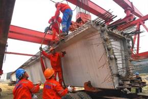 近日,上汽宁德基地蕉城三屿园区内,一片35米长重137吨的预制箱梁在机器的轰鸣声中稳稳地架设于福宁北路七都溪特大桥11#、12#墩上。该首片预制箱梁的成功架设,标志着由隧道股份路桥集团承建的七都溪特大桥工程正式进入上部结构施工阶段。福建省宁德市委书记郭锡文赴现场为项目建设鼓劲加油。