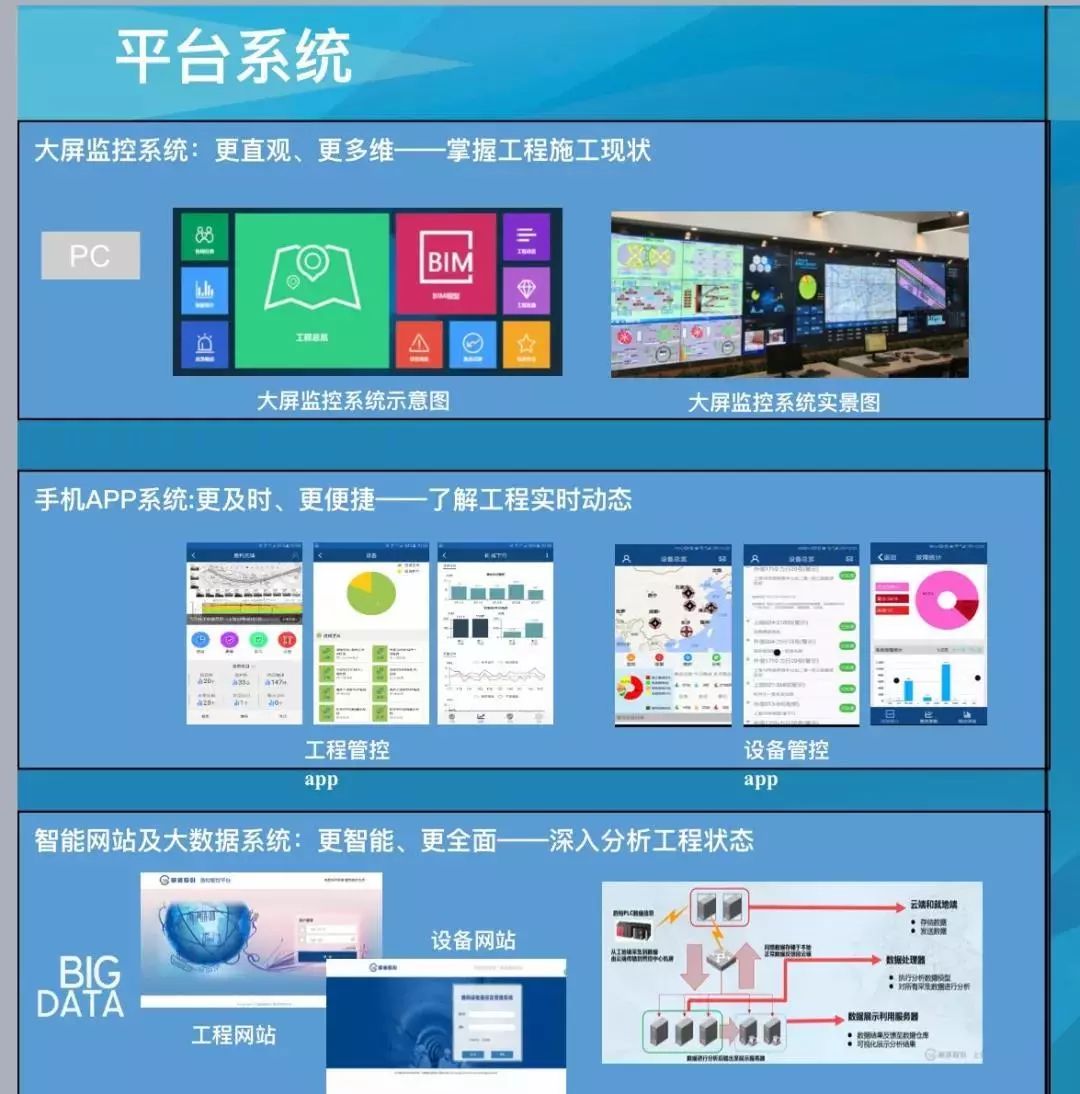 盾构管控中心基于移动化、基地化、智能化的“三化”管理理念,以隧道股份上海隧道五十多年盾构法隧道施工经验为基础,结合移动互联信息时代的各项先进技术,针对性的开发了手机app系统、大屏监控系统、智能网站系统和大数据分析系统,并以此四大系统实现对工程施工、盾构装备的动态管理与风险管控。