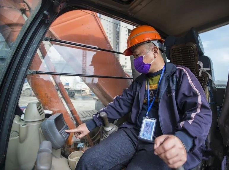 上车前,消毒的步骤不能少。陈师傅给门把手、方向盘、手柄、开关喷上消毒液,仔仔细细擦拭一遍后,才开始了一天的工作。虽然驾驶室空间不足一平米,陈君文却觉得十分安全。“边工作边隔离,上班也很安心。”陈师傅已有10年的开挖机经验。2019年,他在文明东越江通道上岗。春节前他选择回家过年。但突如其来的疫情阻挡了他和工友们的返岗步伐。“那时候急坏了,特别想返岗,但是又出不去。”为了让陈师傅能够顺利返岗工作,隧道股份市政集团为每一位工友都开具了“返岗介绍信”,并为他们单独安排了返岗前的健康检查,为他们平安复工开辟“绿色通道”。在项目部的全力支持下,2月15日一大早,陈师傅就出现在了工地。半个多月没开挖机,坐在驾驶位上,他又找回了熟悉的感觉。“开上挖机,我的心里也踏实了。”