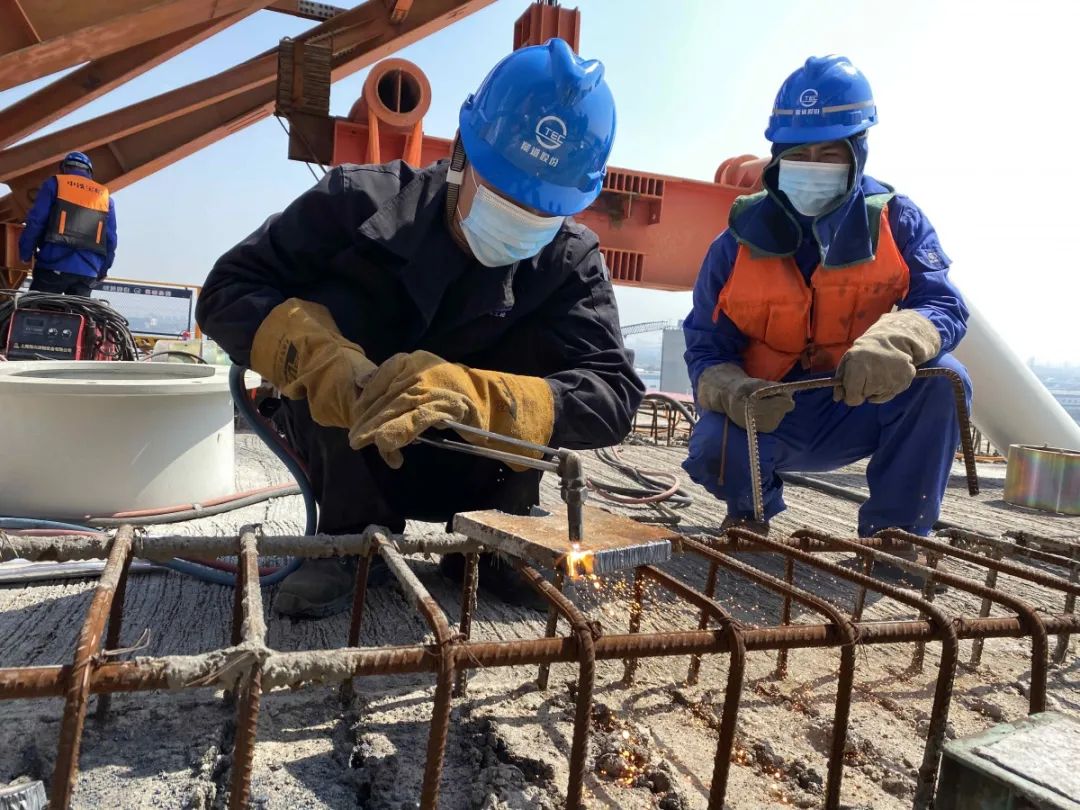 专业割枪喷出光亮的火星,一根根斜拉索的索套管被有序拼接起来,十数名身着隧道蓝的工人正在热火朝天地复工忙碌。伴随机器轰鸣声此起彼伏,760吨大桥节段主梁稳稳吊起,与主桥“拼接”在一起,吊装的精度精确到了毫米级……
