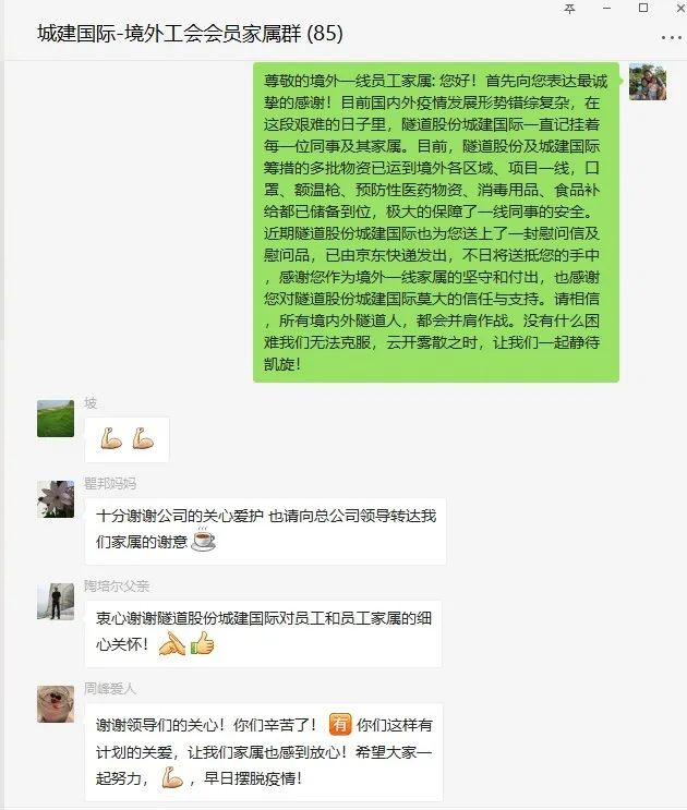 在境内“大后方”,我们全力照料好每一位员工的家属和亲人,搭建起与他们的直接沟通渠道。