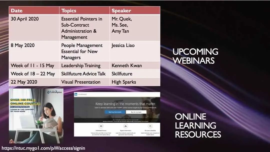 自新加坡区域中心的员工开启居家办公以来,隧道股份城建国际充分利用居家时间,为员工开设了总计5场的职业能力培训专业课程。