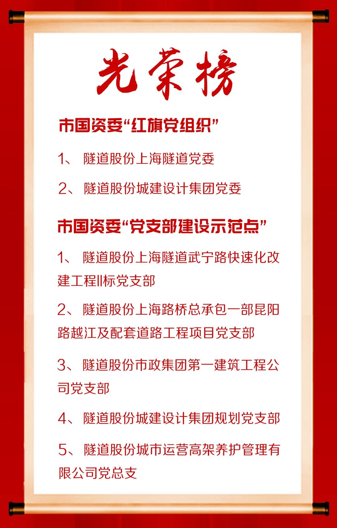 6月28日上午,上海市国资委召开庆祝建党99周年暨红旗党组织、党支部建设示范点命名大会,对系统内红旗党组织和党支部建设示范点进行授牌表彰,由隧道股份党委申报的7家党组织经过组织推荐、实地检查、机关评审、微信投票、评审会特色发布等多个环节,从市国资委系统1.4万余个基层党组织中突出重围、脱颖而出,成功获得“红旗党组织”和“党支部建设示范点”荣誉。其中,隧道股份上海隧道、城建设计集团2家党委被授予市国资委“红旗党组织”称号,隧道股份上海隧道武宁路改建工程、上海路桥昆阳路项目、市政集团第一建筑工程公司、城建设计集团规划党支部、城市运营高架养护公司等5家党支部荣膺市国资委“党支部建设示范点”称号。隧道股份党委副书记陆雅娟、党委组织部及相关单位党组织负责人出席庆祝大会。
