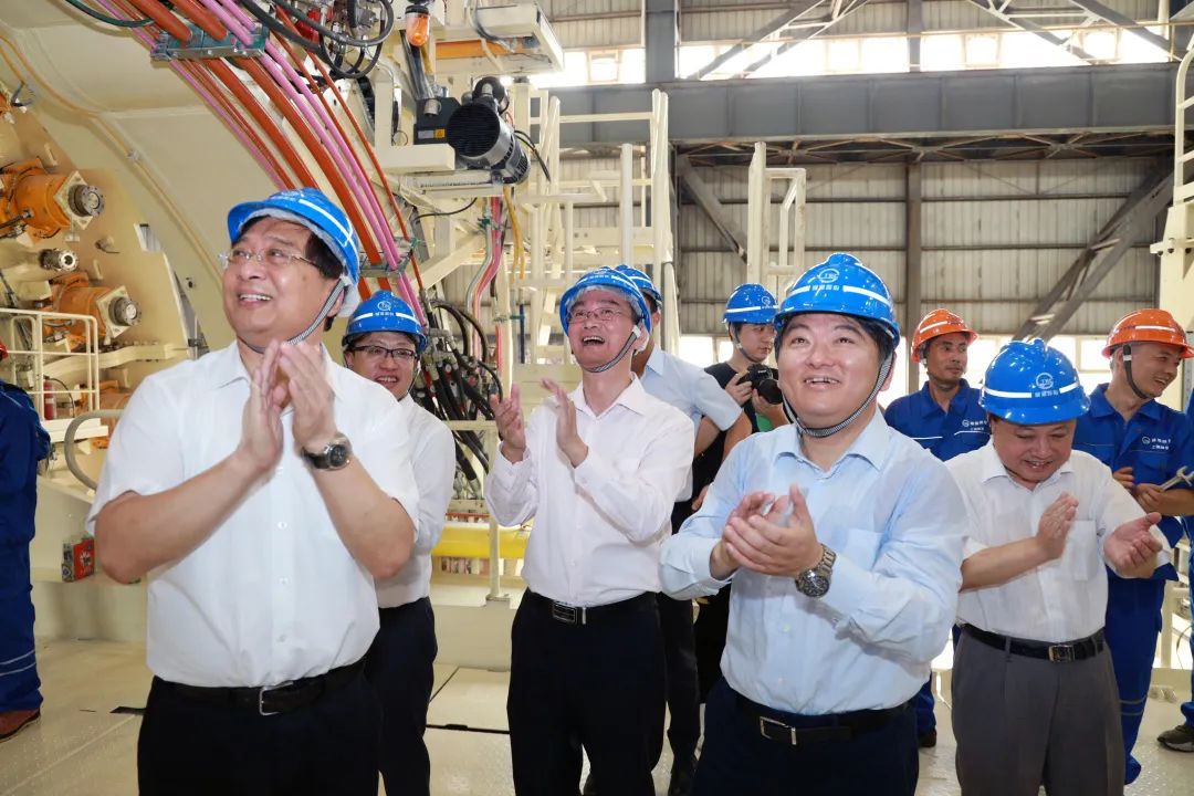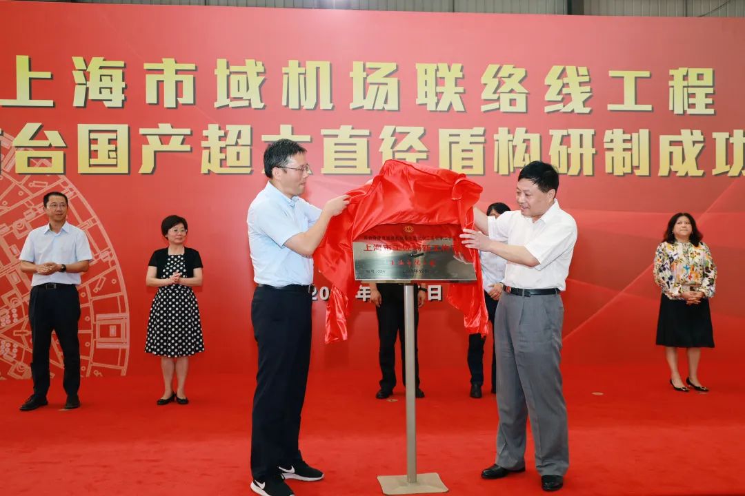 调研现场,莫负春主席与隧道股份党委副书记、总裁周文波共同为国产盾构研发制造团队——隧道股份上海隧道盾构制造团队“上海市工人先锋号”揭牌,并为即将正式投入上海市域机场联络线工程建设的“首台国产超大直径盾构”按下引擎启动键。