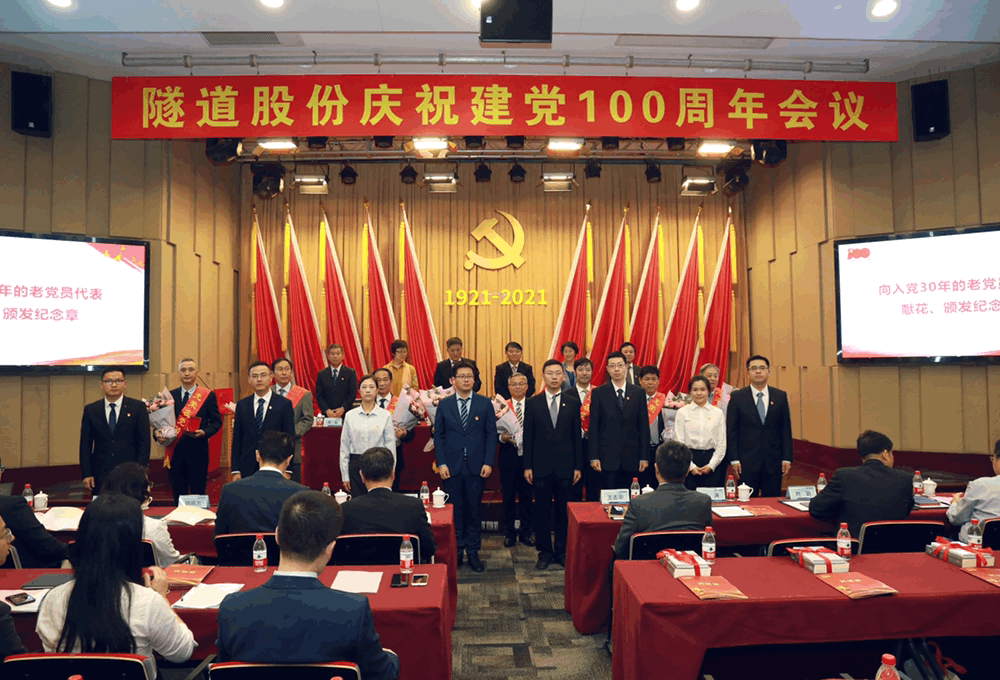隧道股份系统内2021年入党的新党员代表向入党30年的老党员代表献花并赠送纪念徽章,传承榜样守初心,接续奋斗再出发。