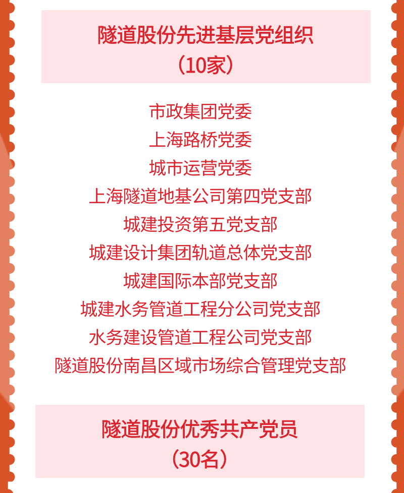 会上,隧道股份党委向隧道股份上海路桥总承包一部桥梁工程项目党支部等20个党支部授予隧道股份“五星级”党支部荣誉称号,向隧道股份市政集团党委等10家基层党组织授予“先进基层党组织”荣誉称号,向冯师等30名同志授予“优秀共产党员”,向丁佳蕾等10名同志授予“优秀党务工作者”荣誉称号。