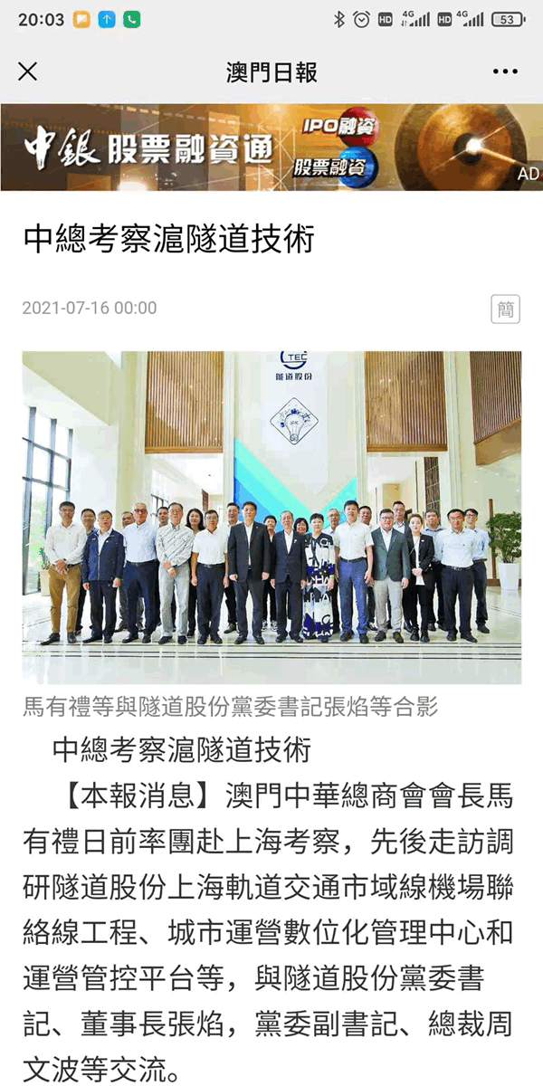7月11日-13日,全国政协常委、澳门中华总商会会长马有礼率团赴上海考察,先后走访调研隧道股份上海轨道交通市域铁路机场联络线工程、城市运营数字化管理中心以及隧道股份总部数字化管控平台,通过深度探访超级工程、智管中心,深入了解上海、了解隧道股份的先进建设技术和前瞻管理理念,希望隧道股份加强与澳门的技术研发、人才交流、项目合作,为促进沪澳两地经济社会持续健康稳定发展、为国家“一带一路”、“粤港澳大湾区”高质量建设做出积极贡献。