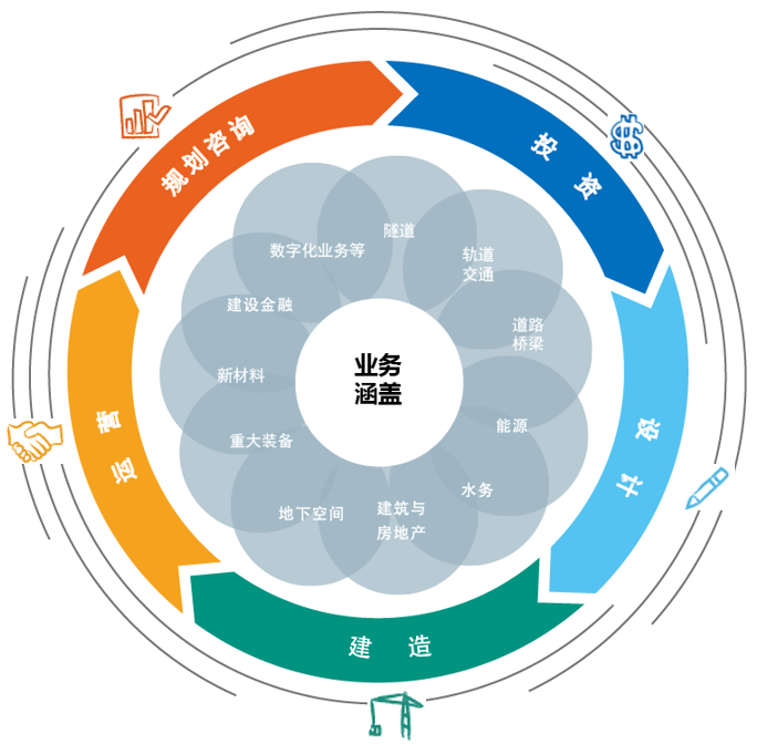 我们的产业链齐全——我们“专领域、深开发、广覆盖”,从规划咨询、投资、设计、建造到运维,为城市基础设施提供全产业链、全生命周期服务。