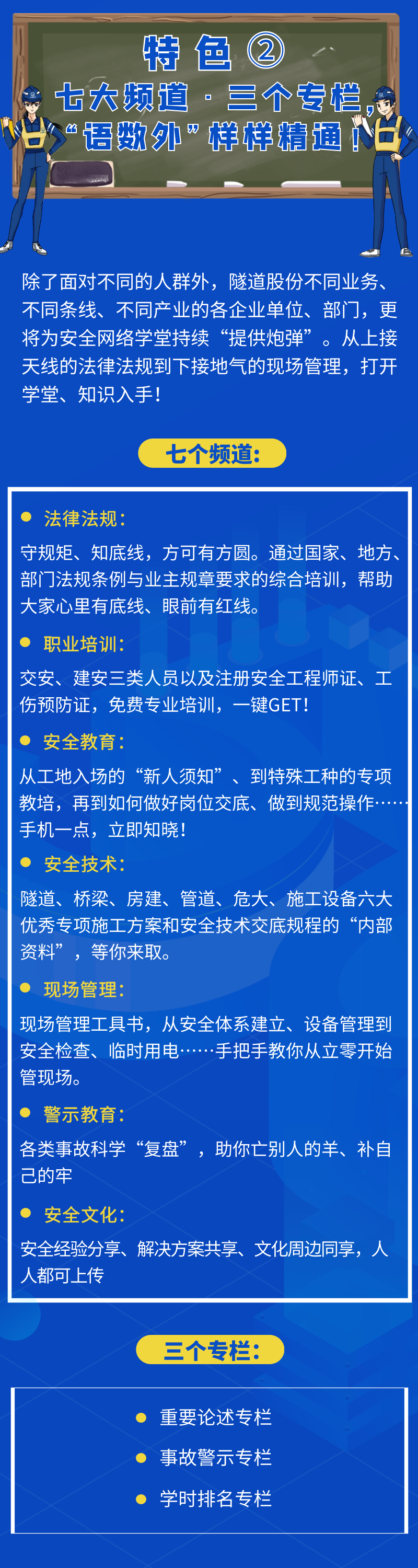 我们要“横向到边、纵向到底”,依托安全网络学堂建成全方位的安全教育培训体系,并最终建立属于隧道股份的“安全文化”——从上到下、从自有员工到供应链企业,让每一名隧道人都树牢安全意识、牢记安全知识。