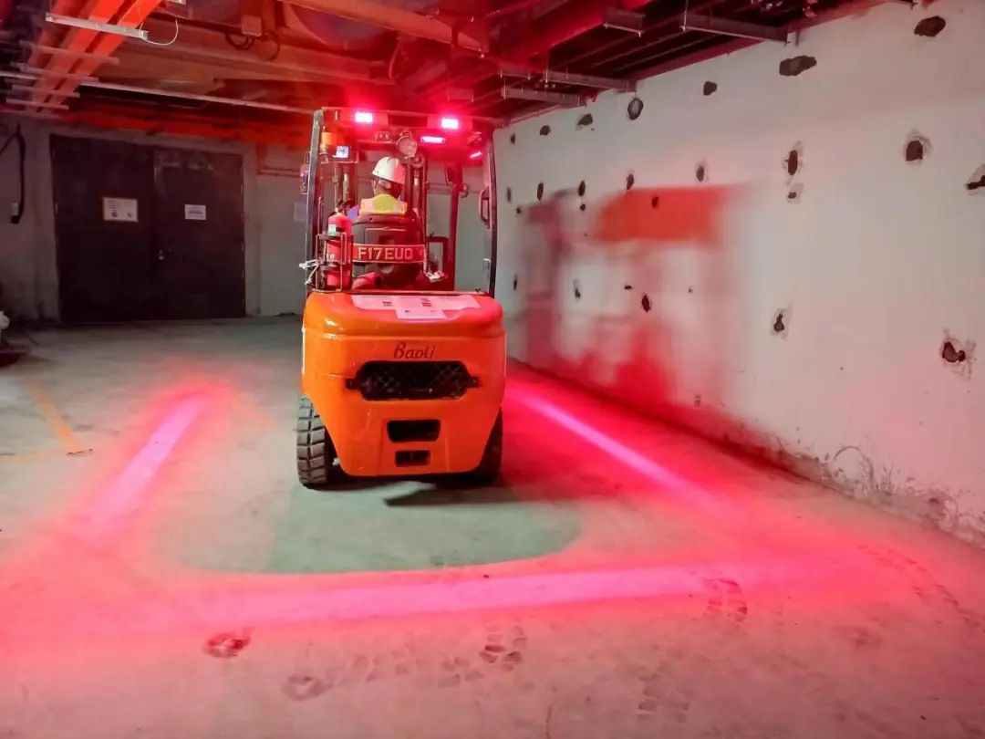 在日常施工作业中,叉车的用途较广,但很多时候因为叉车驾驶过快、驾驶员视线有限或工作区域狭小等原因,极易造成人员受伤。隧道股份城建国际创新在叉车上安装区域警示灯,使叉车在作业行使时四周地面出现红色警示区,从而使周边人员自动保持在该警示区域外,降低事故发生概率。