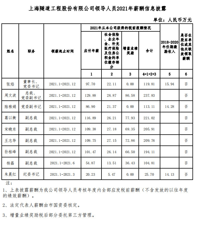 上海隧道工程股份有限公司领导人员2021年薪酬信息披露