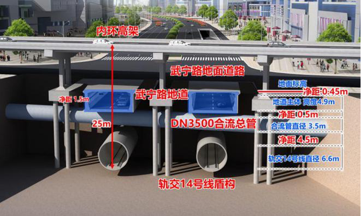 在中山北路高架桥下,武宁路快速化改建工程主体基坑与污水总管仅有不到30厘米的距离。为了保障污水总管安全,隧道股份项目团队成功实施了国内首例超大口径污水总管不断水工况下的内壁保护修复施工。