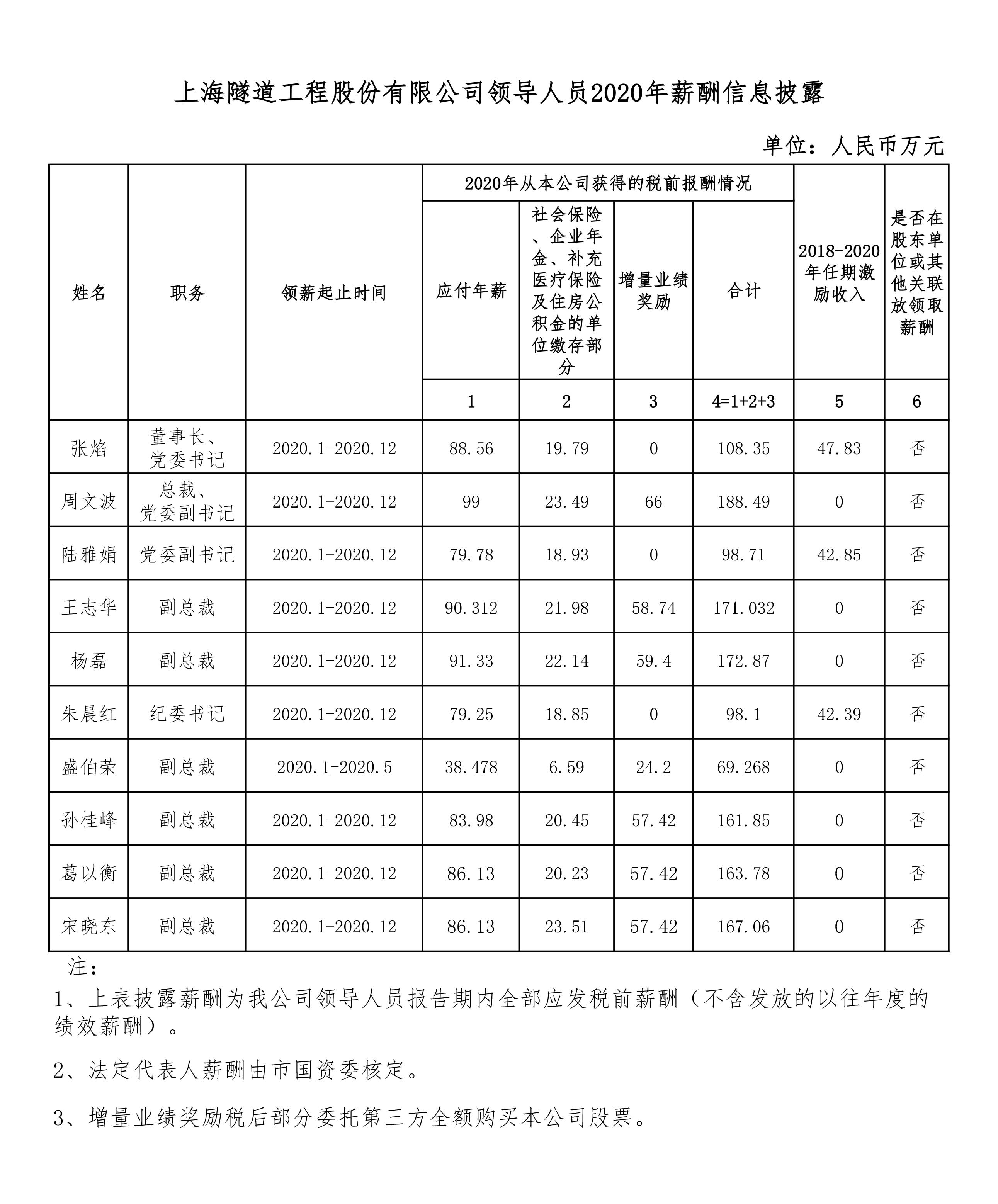 上海隧道工程股份有限公司领导人员2020年薪酬信息披露