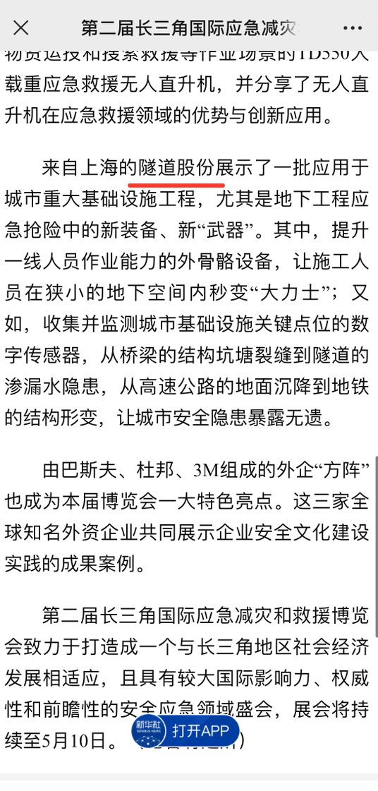 5月8日,隧道股份参展的2023长三角国际应急减灾和救援博览会胜利开幕。在本次展会上,隧道股份以“向险而行、守护无声”为主题,展呈了隧道股份在城市应急抢险与防灾减灾方面的一系列新装备、新技术、新思路、新模式,展现了隧道股份以“全产业链、全风险链”推动安全韧性城市建设、助力城市风险防控的生动实践,受到了国家应急管理部、上海市委市政府、长三角三省一市应急管理局及全国防灾减灾领域行业、企业相关领导专家的高度评价。