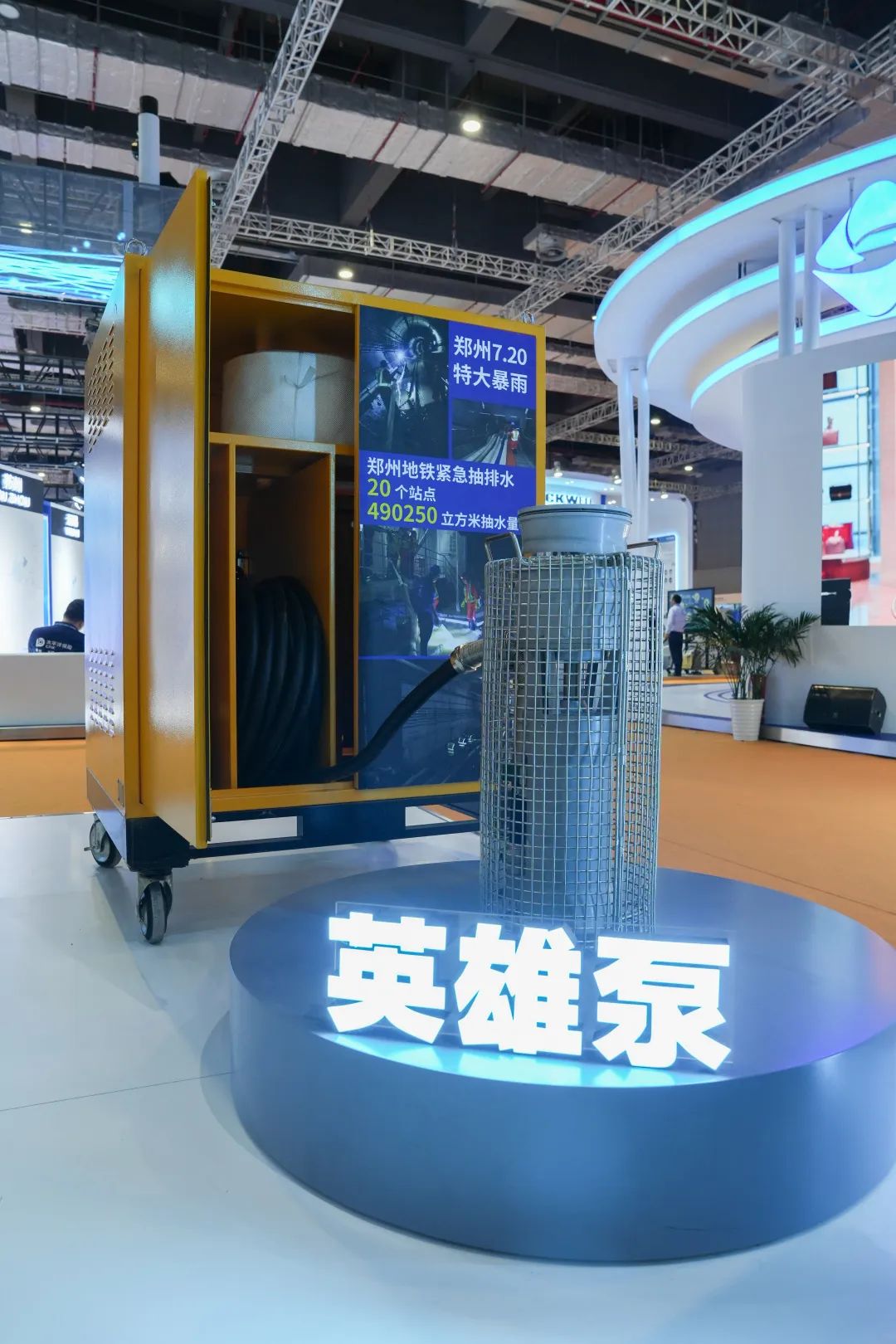 2021年郑州遭遇7.20特大暴雨,隧道股份上海隧道、市政集团、城盾隧安等协助郑州地铁实施5号线排水抢险作业,紧急抽排水20个站点,累计抽水量490250m³,为郑州隧道抢险救援与地铁早日恢复做出贡献。在本届展会中,隧道人展出了连续应用于郑州地铁、下立交等多个抢险点位,以大功率的抽排能力,被誉为“英雄泵”的高性能设备。