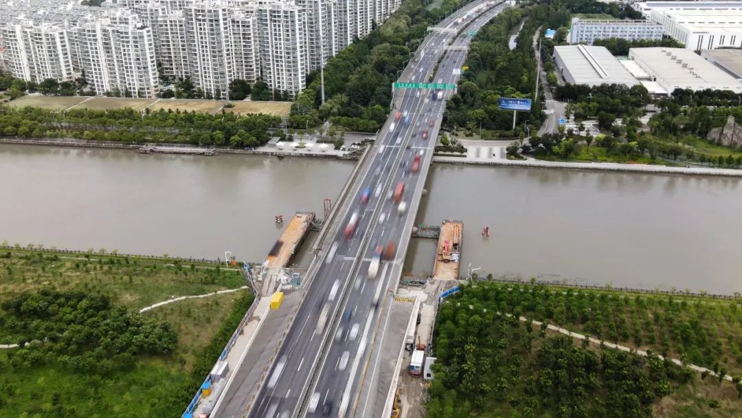 除了主线道路外,隧道股份还需要对原有的6座大桥、23座中小桥进行更新。这些桥梁是拓宽改建工程中的挑战与难点。如对项目最为关键的祁迁河桥,嘉浏项目团队以整体重建的方式对老桥进行了更新,将原先长371米的老桥“拉伸”到了 552米。期间,项目团队倒排工期、合理部署、科学组织,先后克服两阶段的钢箱梁线形相匹配难度大、拼接高差控制难等挑战,与主线道路施工齐头并进,顺利实现祁迁河桥(宁波方向)提前合龙。