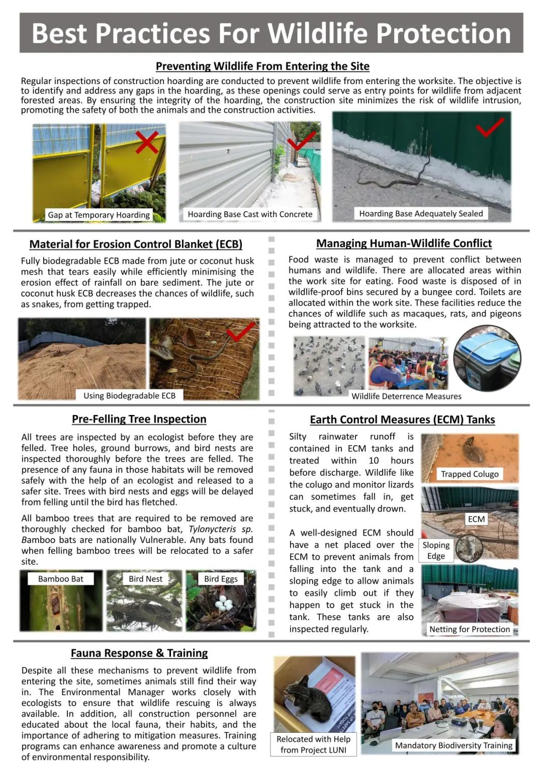 新加坡靠近赤道,为热带雨林气候,全年长夏无冬,生物种类极为丰富。为保护项目范围内的野生动物群体,隧道股份城建国际项目团队将进行专项动物应变训练。如在迁移树木前,邀请生态学专家对树洞、鸟巢、地洞进行检查,对鸟类、竹蝠等动物进行迁徙释放;对有幼鸟和鸟蛋的树木推迟移植,待幼鸟长成、羽翼丰满后再行动。