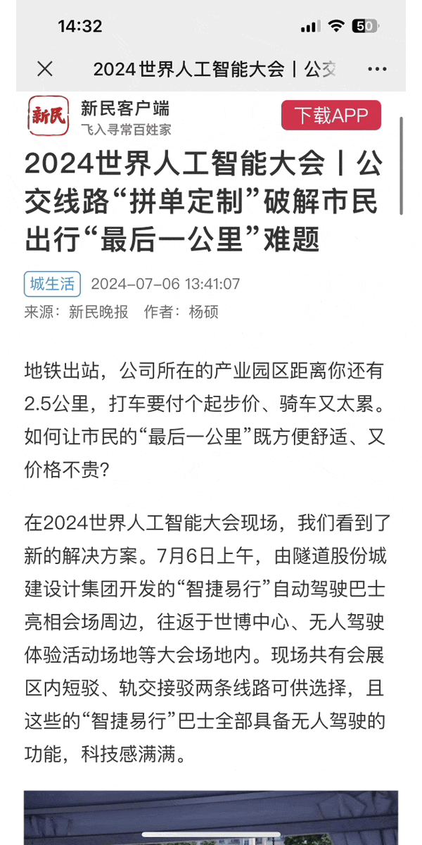 今天下午,隧道股份党委书记、董事长张焰出席世界人工智能大会闭幕式,并赴隧道股份城建设计集团MaaS人工智能需求响应式公交“智捷易行”体验区巡馆,为开发新兴技术、创新商业模式的STEC“数创团队”点赞鼓劲、提出期冀。