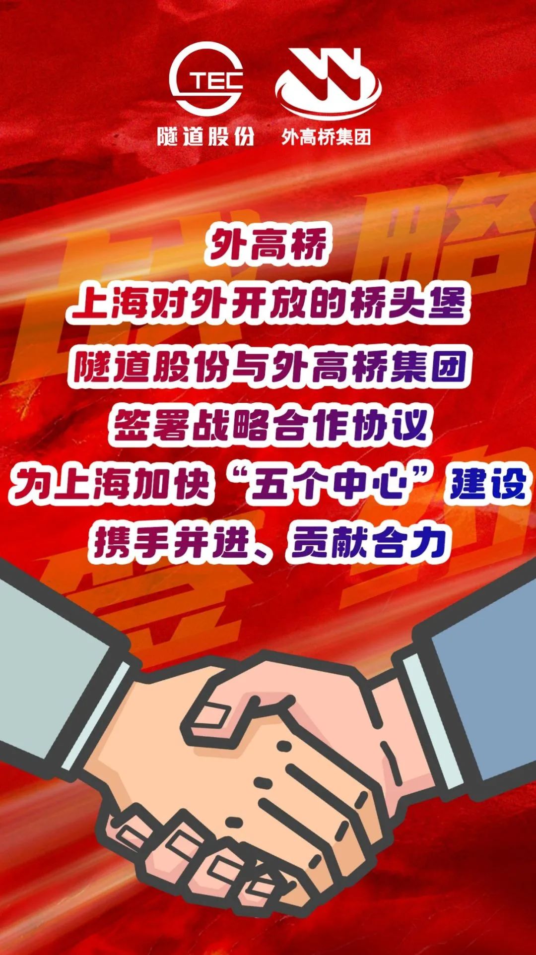4月15日,隧道股份与外高桥集团签署战略合作协议,双方将聚焦未来城市发展与行业迭代升级,建立全面合作伙伴关系,在更高层次、更大范围、更深领域持续深化交流合作,并在加快上海“五个中心”发展和浦东打造社会主义现代化建设引领区的总目标下,增进优势互补、深化务实协作,推动互利共赢、实现共同发展,携手为上海乃至各地城市高质量建设发展做出新的更大贡献。