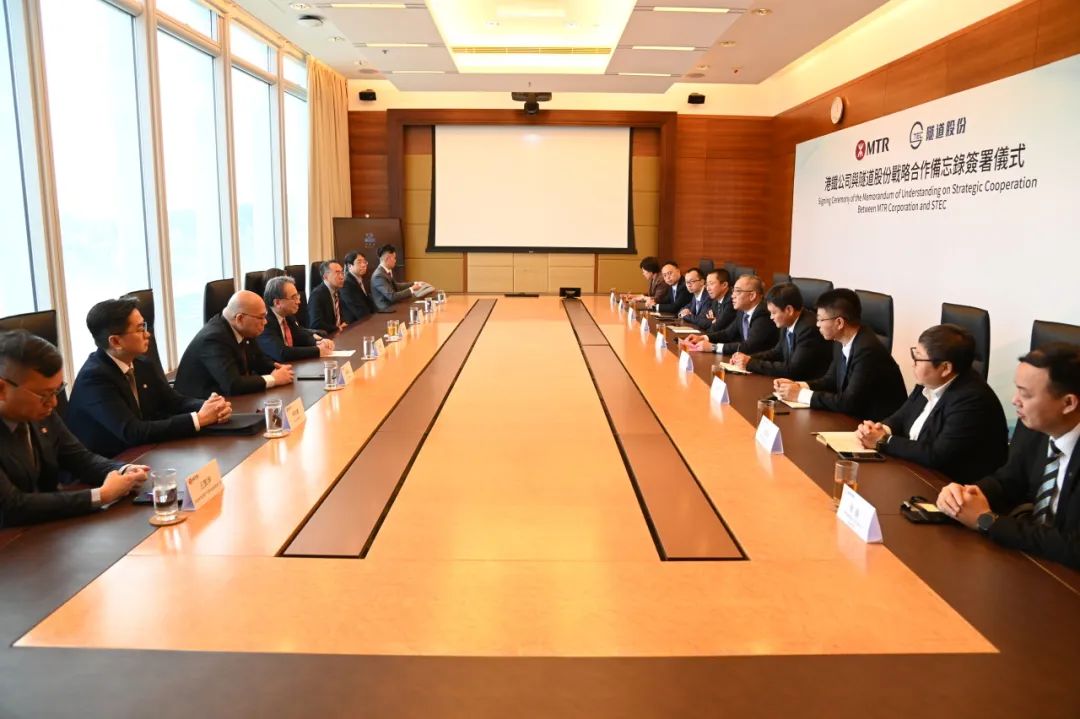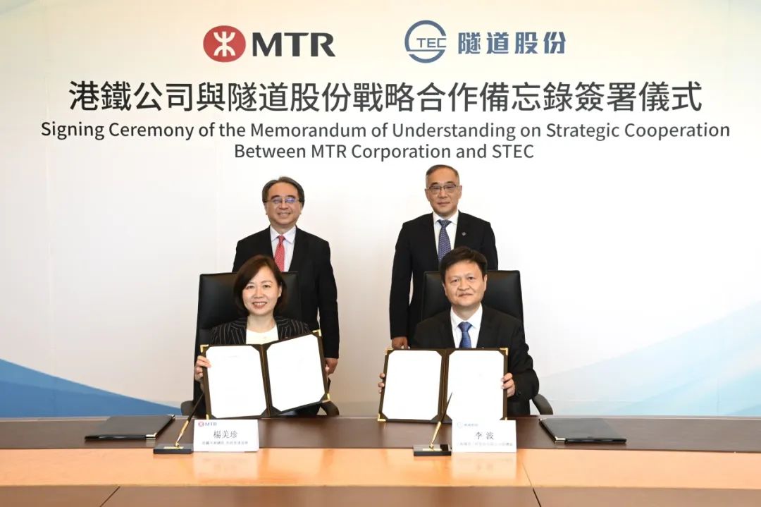 在港铁公司行政总裁金泽培博士,隧道股份党委书记、董事长葛以衡等领导的见证下,港铁公司香港客运服务常务总监杨美珍、隧道股份副总裁李波代表双方签署《战略合作谅解备忘录》。