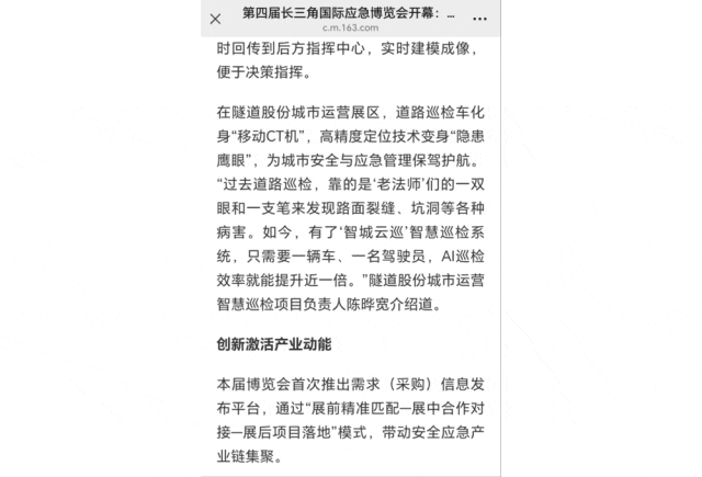大型交通设施是城市的“动脉血管”,也是城市安全保障的核心部位。在本届应急展上,隧道股份上海路桥、城市运营带来了交通设施更新维护的最新技术成果,从“智城云巡”智慧巡检体系到跨海大桥桥梁桩基冲刷技术,一系列新技术、新理念刷新了业界对于“智慧运维”“城市更新”的认知与理解。