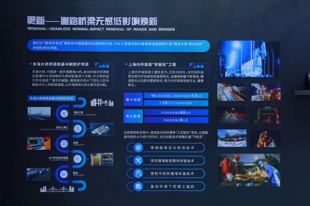 在设施更新方面,隧道股份上海路桥展示了中国第一座外海跨海大桥——东海大桥的最新保护成果。由于复杂的海洋洋流和往复潮汐持续对大桥桩基进行冲刷,对大桥的运行安全造成了潜在威胁。隧道股份上海路桥将水下固化土防冲刷技术引入到桥梁领域,为跨海桥梁的更新维护提供有价值、可借鉴的工程案例模板。