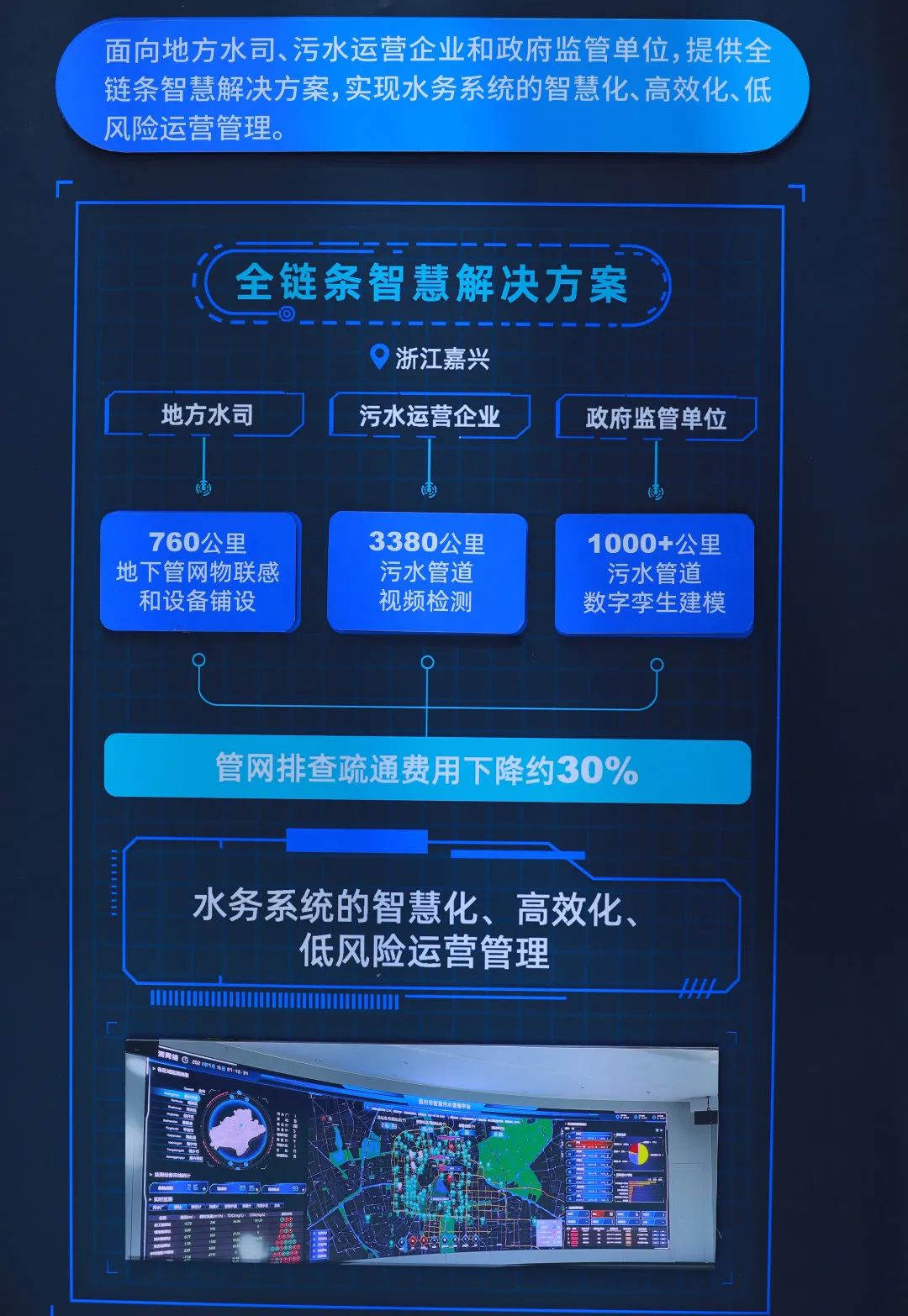 在水务管网方面,隧道股份城市环境、数字集团展示了智慧水务新成果,面向地方水司、污水运营企业和政府监管单位,提供全链条智慧解决方案,实现水务系统的智慧化、高效化、低风险运营管理。目前,在浙江嘉兴,该套解决方案已实现760公里地下管网物联感知设备铺设、3380公里污水管道视频检测、580公里污水管道数字孪生建模,并将管网排查疏通费用下降约30%。